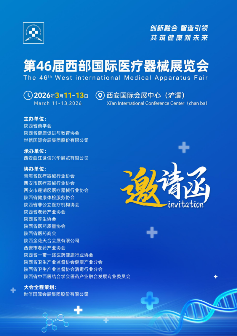 为深入贯彻健康中国战略,加快推动医疗健康产业高质量发展,第46届西部国际医疗器械展览会将于2026年3月11-13日在西安国际会展中心隆重举行。本届展会将继续邀请西部各省市医疗机构、行业协会、采购商、经销代理商及行业专家参与,打造一个集展览展示、专业论坛、供需对接、商贸洽谈和系统服务于一体的全方位、多层次、高品质的行业盛会,助力医疗器械产业高质量发展。